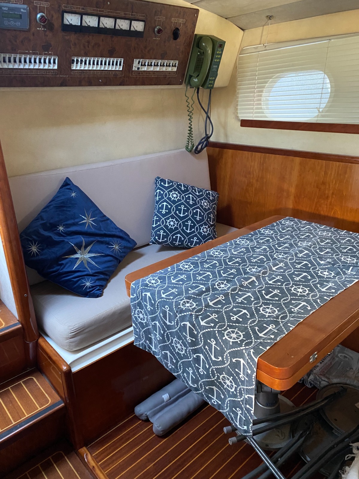 Gli interni esprimono lo stile inconfondibile del cantiere, con ambienti accoglienti e una disposizione studiata per garantire massimo comfort anche durante le crociere più lunghe. Il layout prevede una cabina matrimoniale a prua, rifinita in tessuto e legno, dotata di armadiature e spazi di stivaggio ben organizzati. La dinette centrale, con divano trasformabile, offre due ulteriori posti letto, diventando una zona living confortevole e luminosa, perfetta per rilassarsi o pranzare al coperto. La cucina è completa di piano cottura e frigorifero, con finiture curate e funzionalità che consentono una perfetta gestione della vita di bordo. Il bagno separato, con lavabo, wc marino e doccia, è spazioso e ben rifinito per una barca di questa categoria. L’atmosfera calda degli interni, unita alla luminosità naturale che filtra dai punti luce, crea un equilibrio ideale tra eleganza classica e praticità.