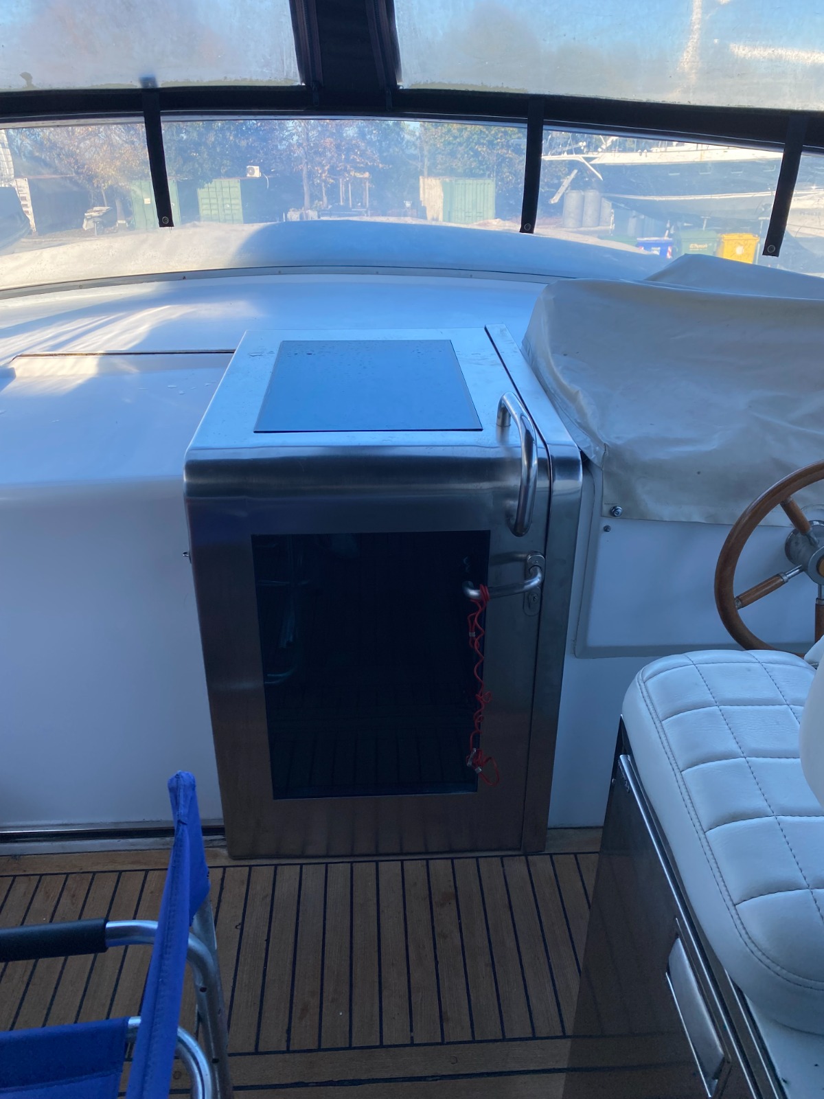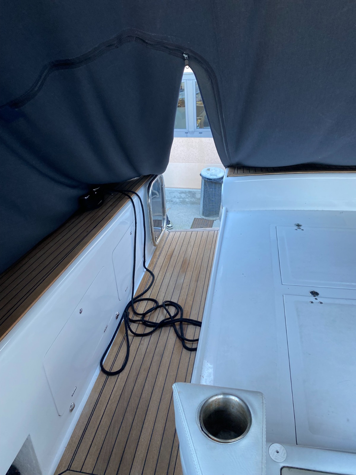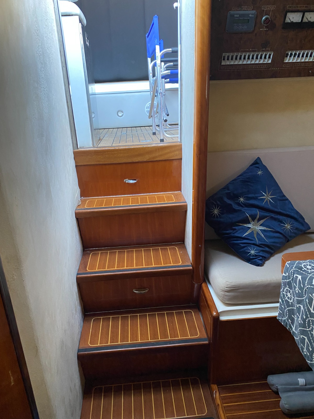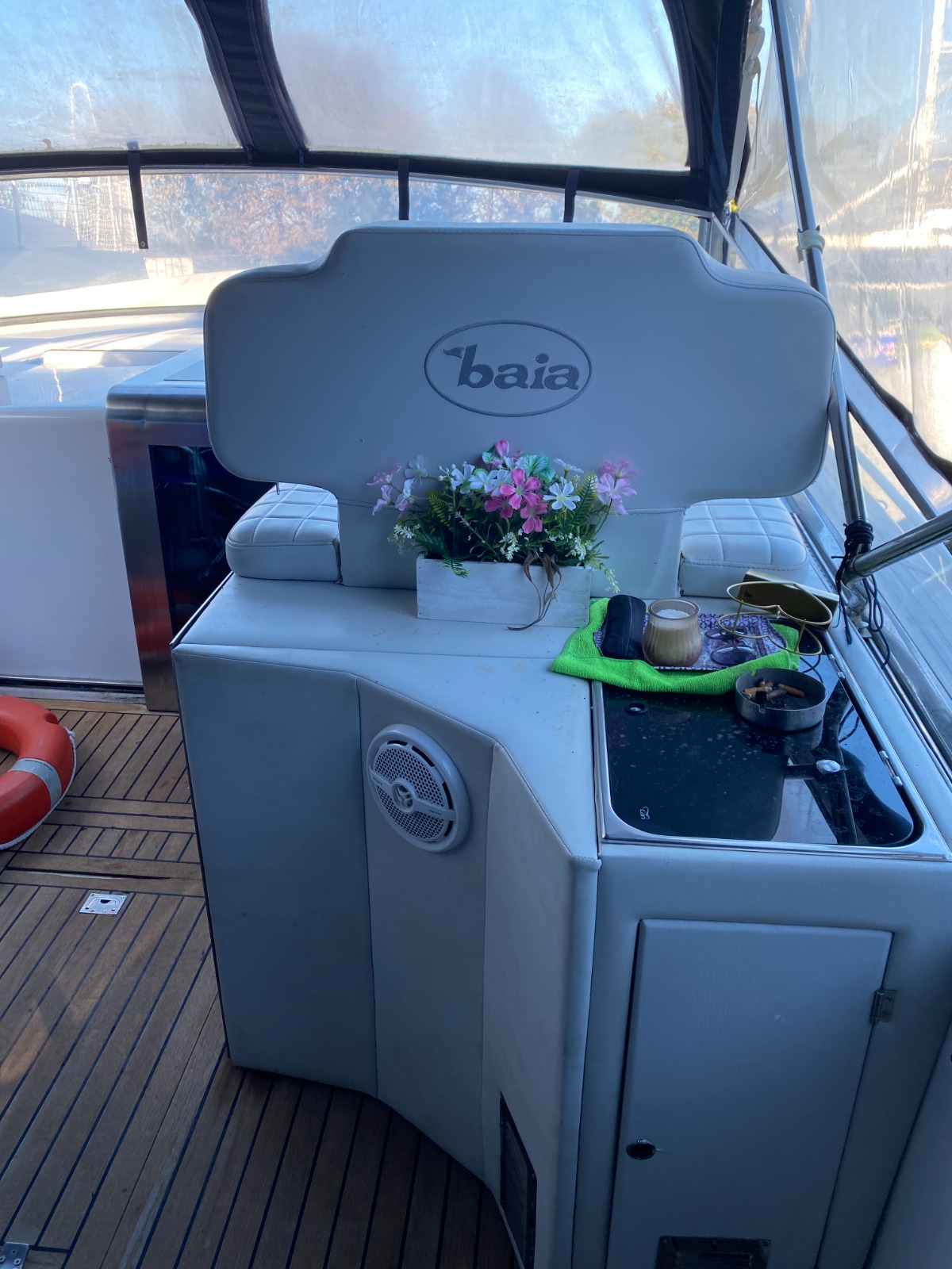 Ma quello che differenzia notevolmente questo Baia 40 dai suoi “fratelli” è stata una modifica essenziale: nel 2019 è stato completamente modificato nel layout esterno per far diventare la zona living molto più comoda e spaziosa. E’ stato inserito un pratico sportello di accesso dalla poppa e un corridoio che evita di montare direttamente sul prendisole, è stato spostato il posto guida a destra, aggiunto un fornello e un lavabo oltre a un grande frigo. Il divano a L e il tavolo apribile ospitano sei persone comode a mangiare ed è rimasto un generoso prendisole a poppa. Pozzetto e passaggi a prua sono stati impreziositi dall’uso di ottimo teak.